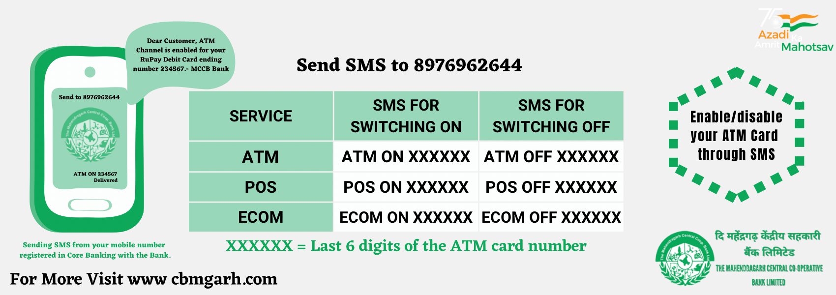 TBLK <Last 6 digits of Card>TUNBLK <Last 6 digits of Card>POS ON <Last 6 digits of Card>POS OFF <Last 6 digits of Card>ECOM ON <Last 6 digits of Card>ECOM OFF <Last 6 digits of Card>ATM ON <Last 6 digits of Card>ATM OFF <Last 6 digits of Card>5. Block a Lost or Stolen CardPBLK <complete account number(15 digits)>For further assistance, visit your nearest The Mahendragarh Central Cooperative Bank Ltd. branch.